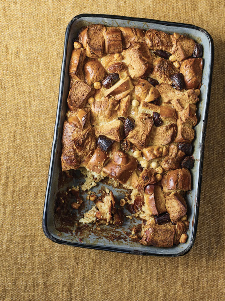 Bread Pudding with Dates, Tahini and Hazelnuts